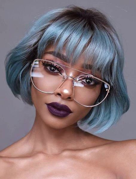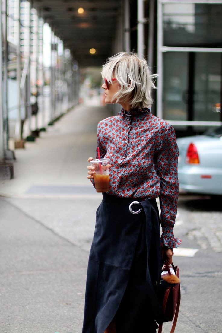 Printed button up, shot bob, and long skirt