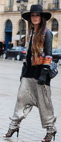 Slouch blinged out pants rocked out with a leather and hand woven details.