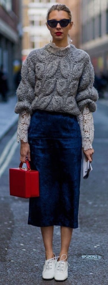 A woven sweater, paired with lace and denim, with a pop of red